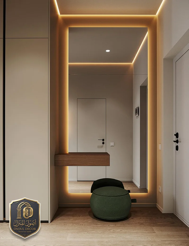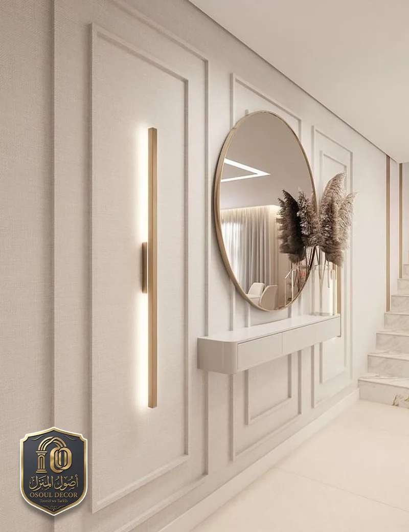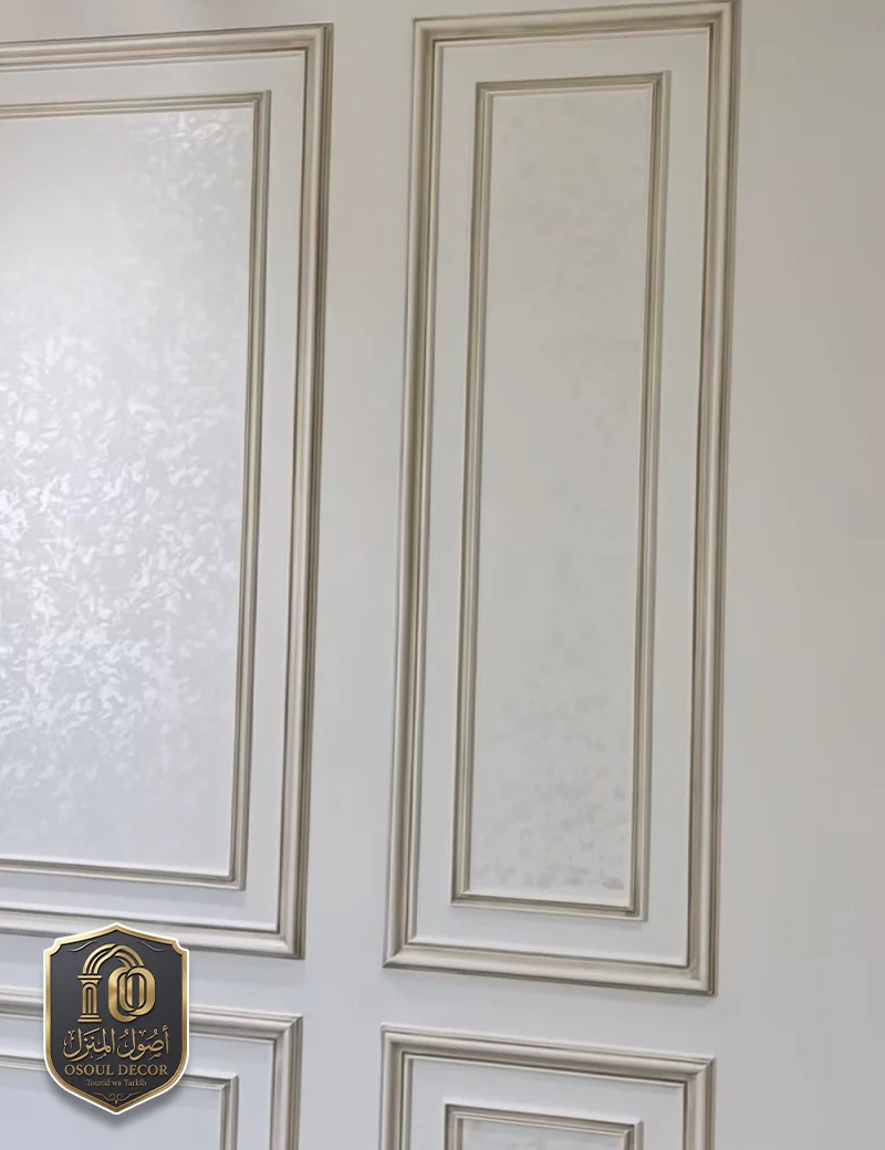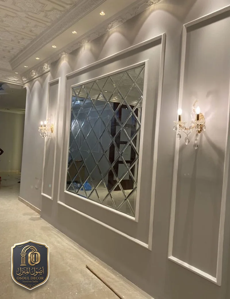 لمسة النيو-كلاسيك التي تضاعف إشراقة الممرات وغرف المعيشة. تفصيل براويز فوم كورية عالية الكثافة مدمجة مع المرايا المشطوفة بدقة ليزرية، لتضفي اتساعاً للمكان وتعكس الإضاءة الدافئة باحترافية.