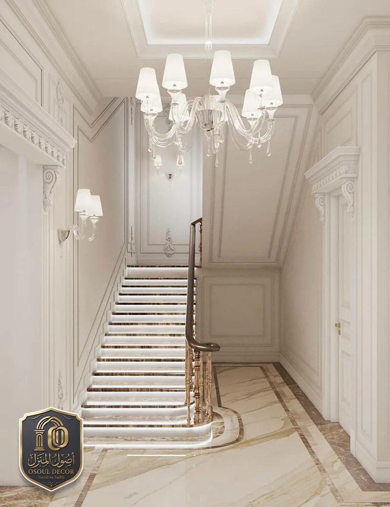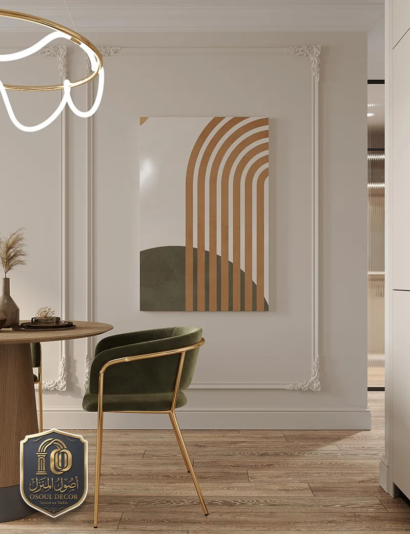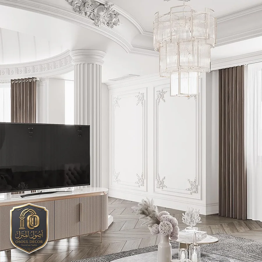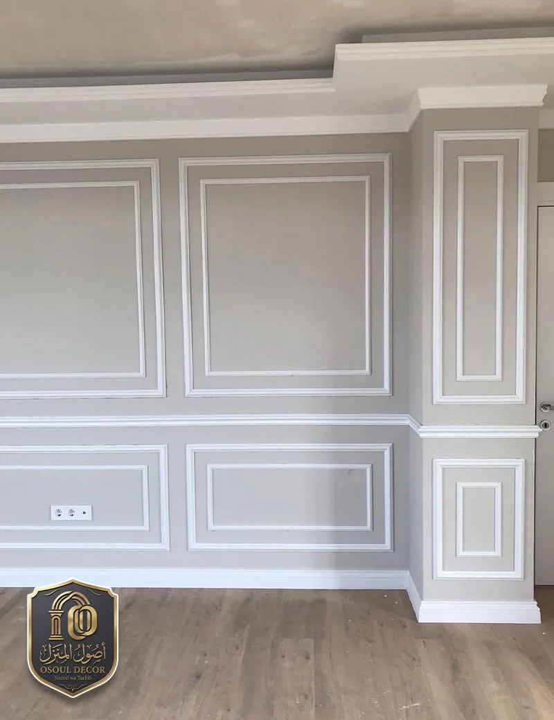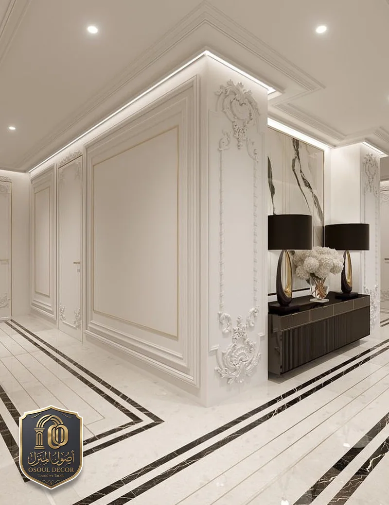 لمسة النيو-كلاسيك التي تضاعف إشراقة الممرات وغرف المعيشة. تفصيل براويز فوم كورية عالية الكثافة مدمجة مع المرايا المشطوفة بدقة ليزرية، لتضفي اتساعاً للمكان وتعكس الإضاءة الدافئة باحترافية.