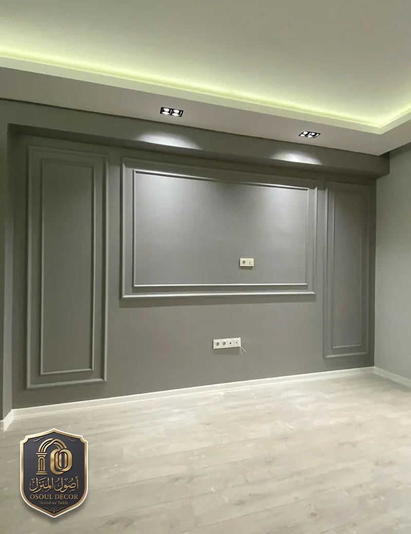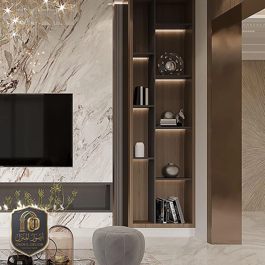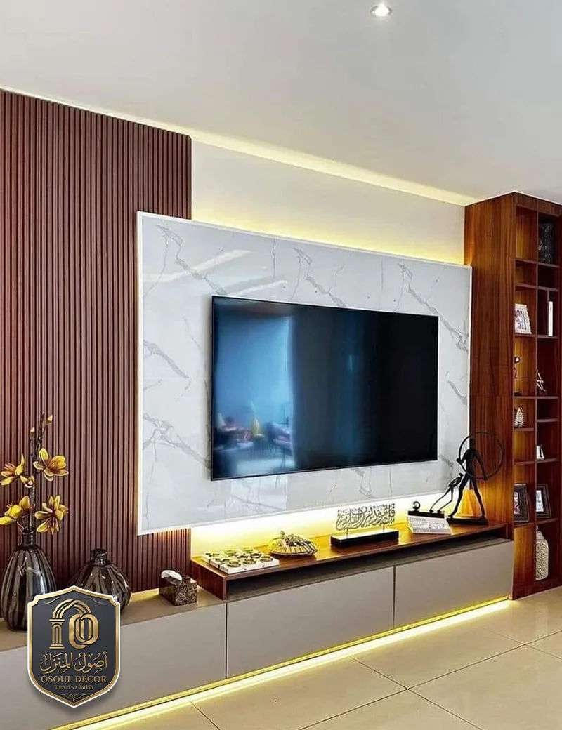 اجعل جلساتك الشتوية حول التلفزيون العائلي أكثر فخامة. نصمم وننفذ خلفيات شاشات تدمج الدفء الخشبي مع لمعان بديل الرخام، مزودة بأرفف (كونسول) عائمة أو إضاءات مخفية تبرز جمال الخامات بدون أي أسلاك مزعجة ظاهرة (ديكور تغطية طلبون).